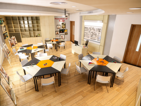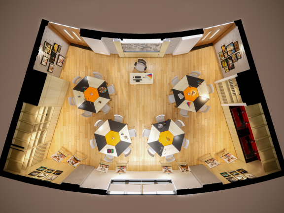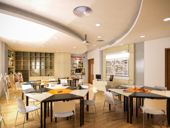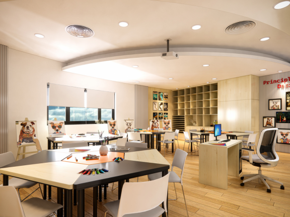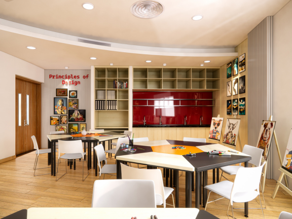 Dự án thiết kế phòng họa tiểu học VAS Sala được xây dựng như một không gian sáng tạo mở, nơi trí tưởng tượng và cảm xúc của các em học sinh được tự do thể hiện qua màu sắc và đường nét. Không gian phòng được thiết kế sinh động, hài hòa giữa ánh sáng, màu sắc và bố cục, giúp các em cảm thấy hứng thú, thoải mái và dễ dàng hòa mình vào các hoạt động mỹ thuật.